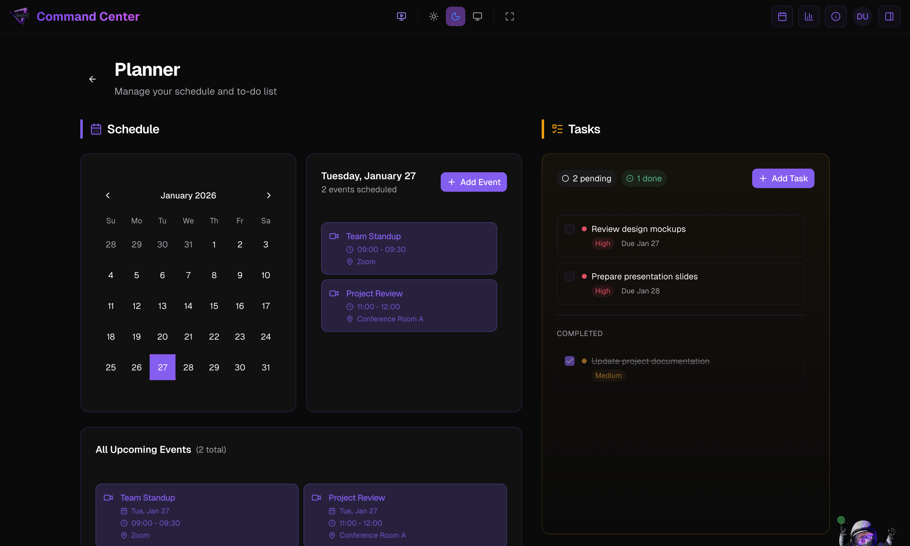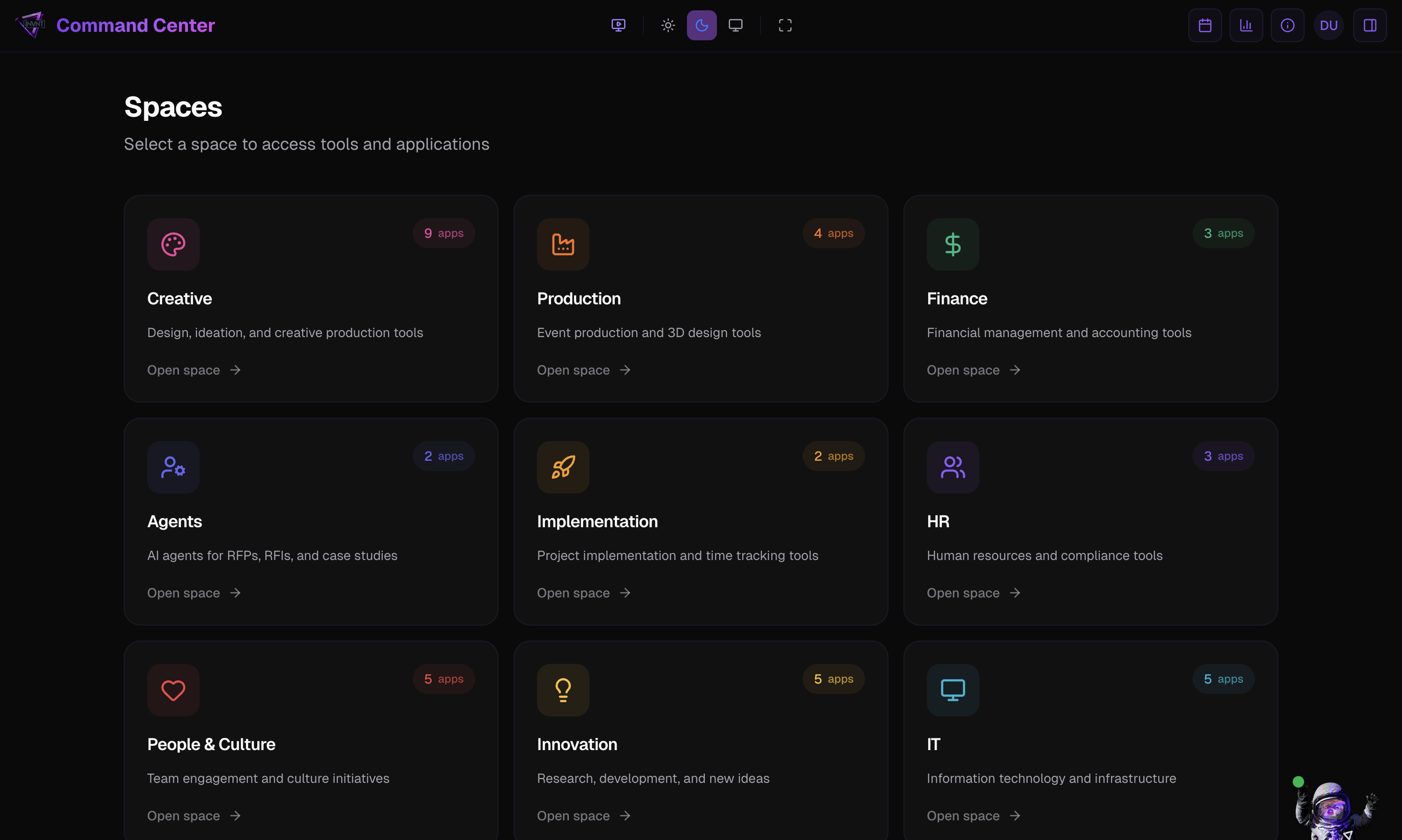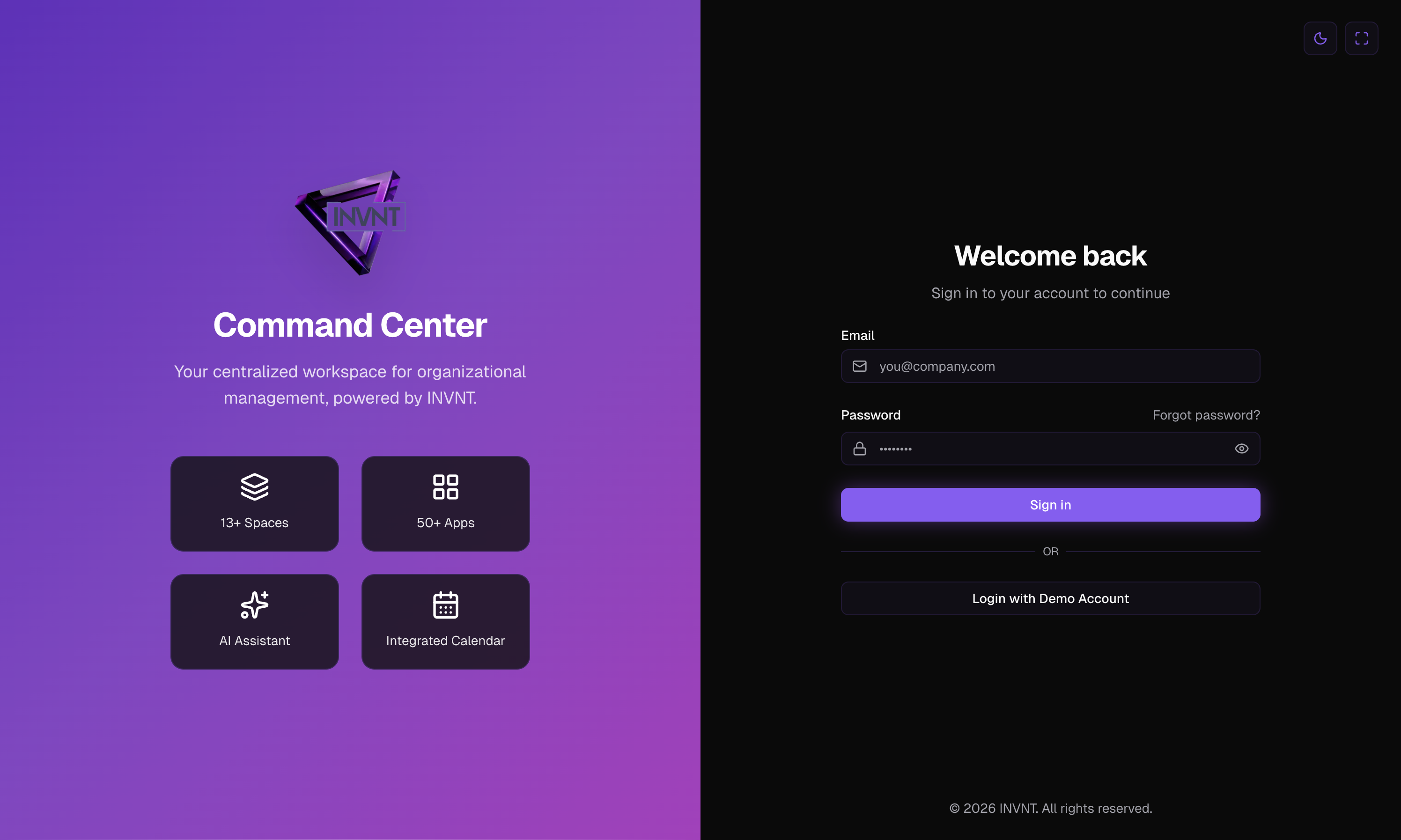 The INVNT Command Center is a sophisticated dashboard that organizes all company tools and applications into intuitive “spaces” while providing real-time analytics, calendar integration, and intelligent workspace management.