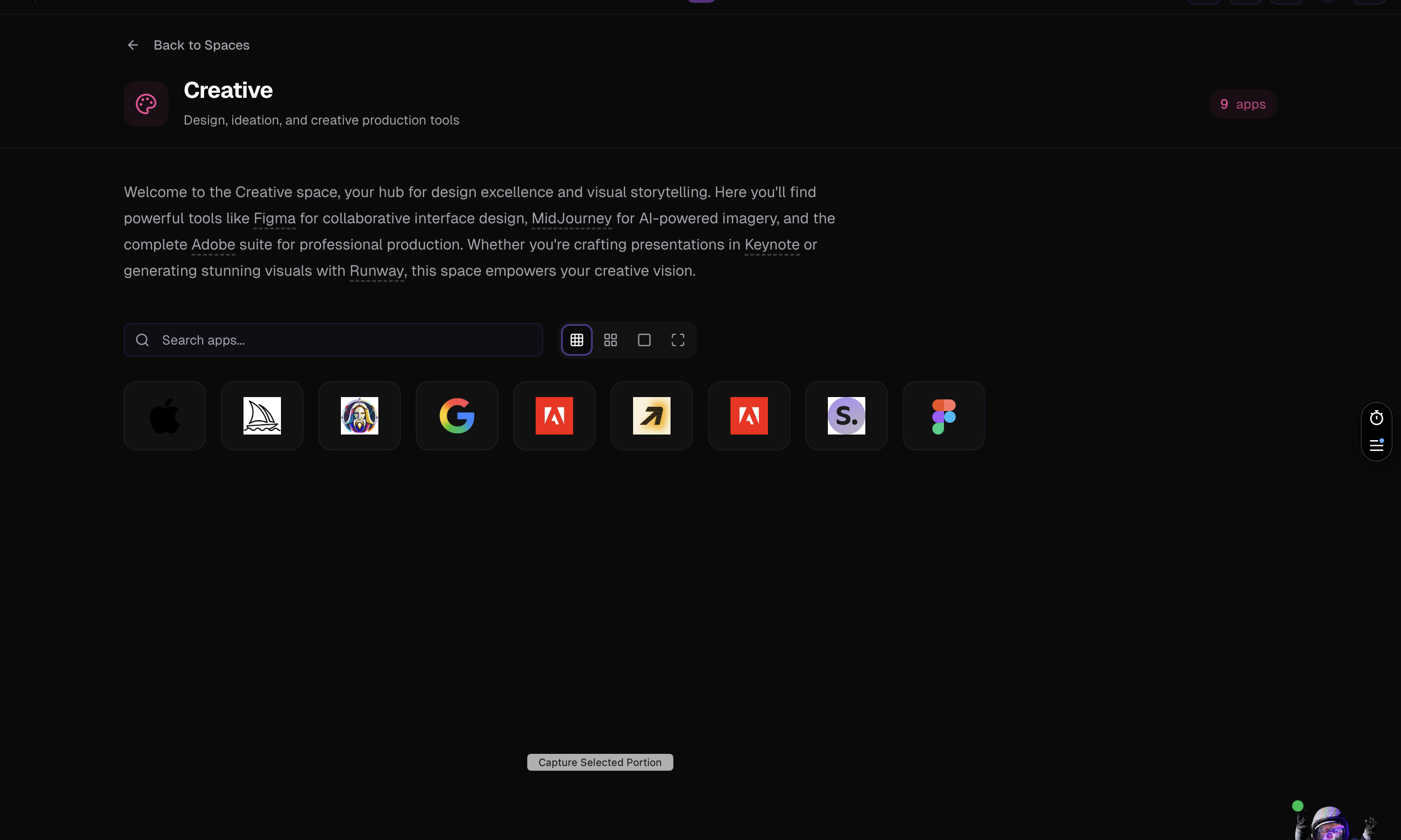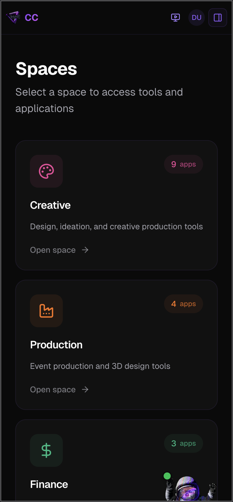 The platform features 15+ specialized spaces—Creative, Production, Finance, HR, IT, Innovation, and more—each containing relevant tools and applications. This space-based organization provides logical grouping that matches how teams actually work, with direct access to 50+ tools including Figma, Adobe Creative Cloud, Xero, NetSuite, Slack, and specialized event management software.